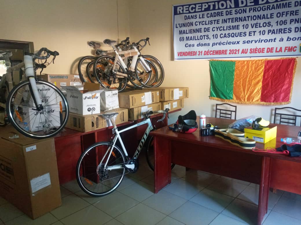 L’Union Cycliste Internationale (UCI) et la Fédération Malienne de Cyclisme (FMC) renforcent davantage leur collaboration. En effet, l’instance suprême du vélo mondial, vient d’offrir un important lot de matériel à la Fédération Malienne de Cyclisme. Composés de : 10 vélos, 106 Pneus, 40 Bidons d’eau, 69 Maillots, 10 Casques et 10 Paires de Chaussures dont la valeur s’élève à près de 70 millions FCFA, ces matériels ont officiellement été présentés à la presse ce vendredi 31 décembre 2021 à la faveur d’une cérémonie grandiose.